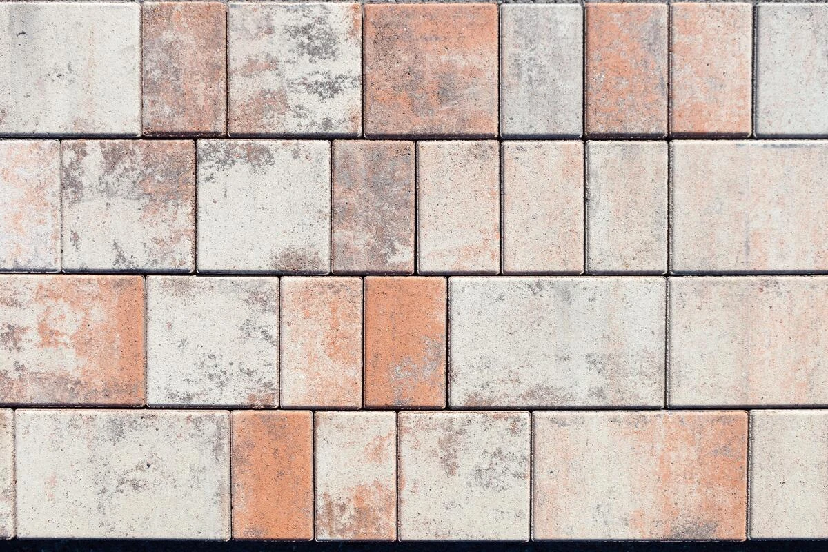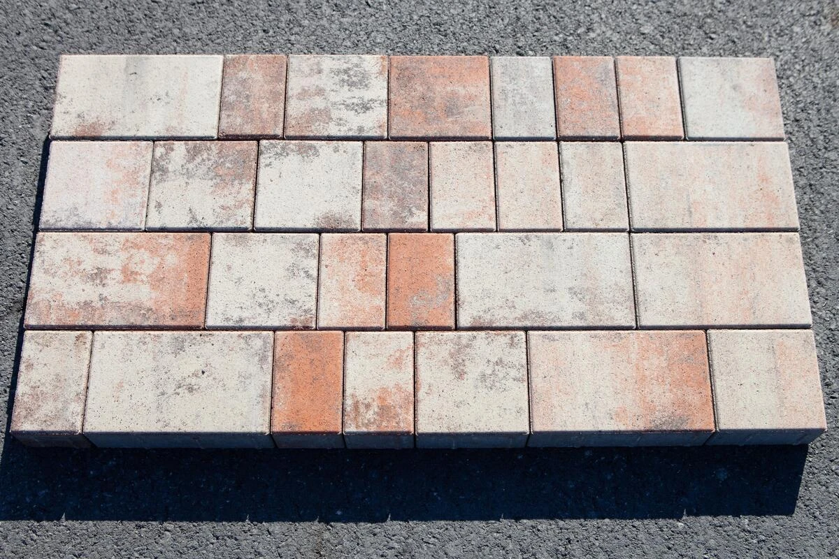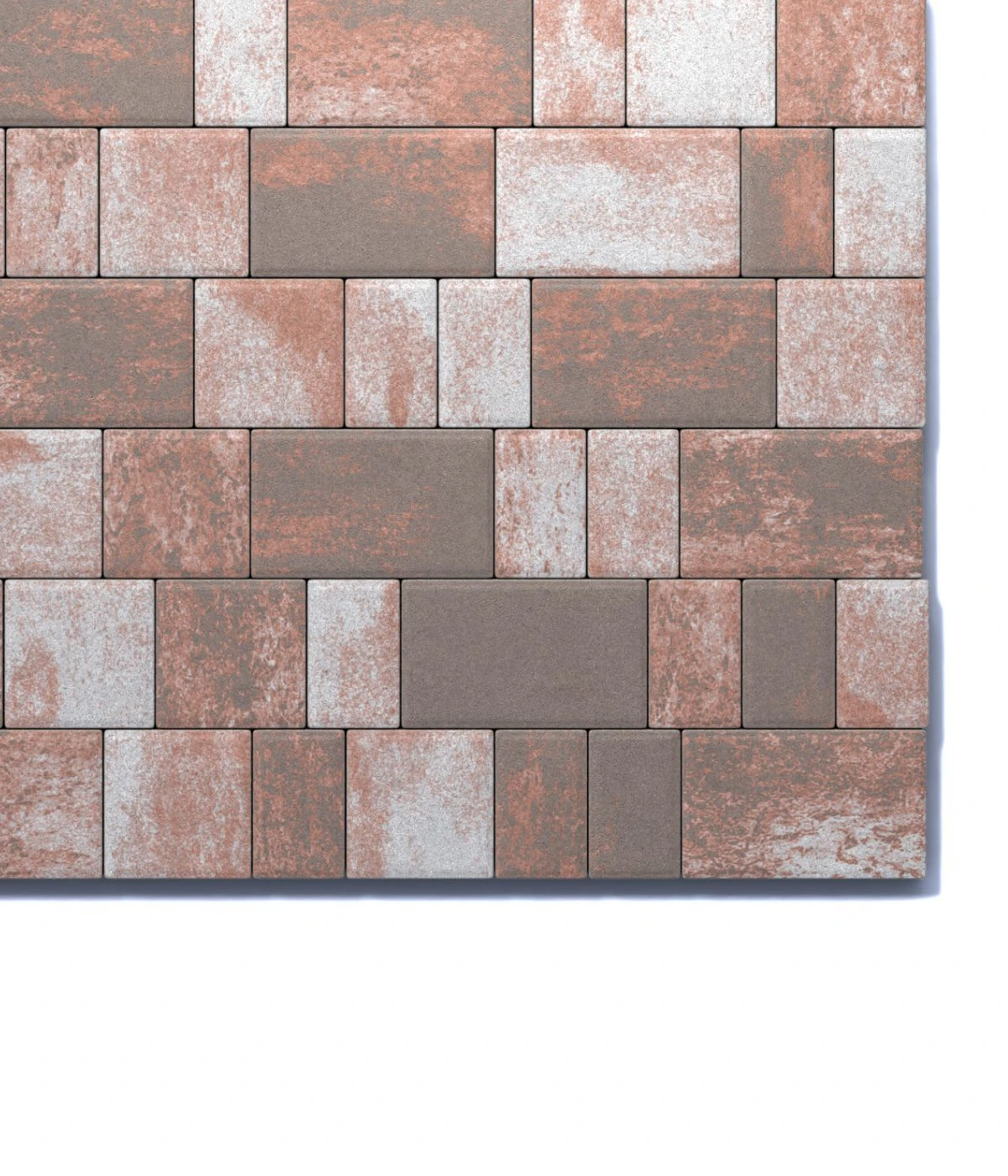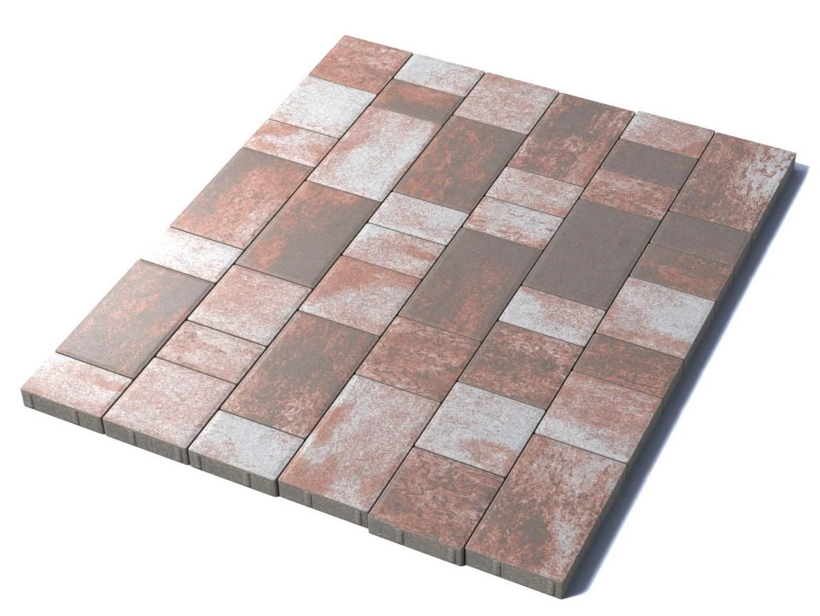 Состоит из 3-х элементов, которые выкладываются в хаотичном порядке рядами. Изготавливается по уникальной технологии методом полусухого вибропрессования из бетона. Поверхность бело-коричнево-оранжевого цвета.