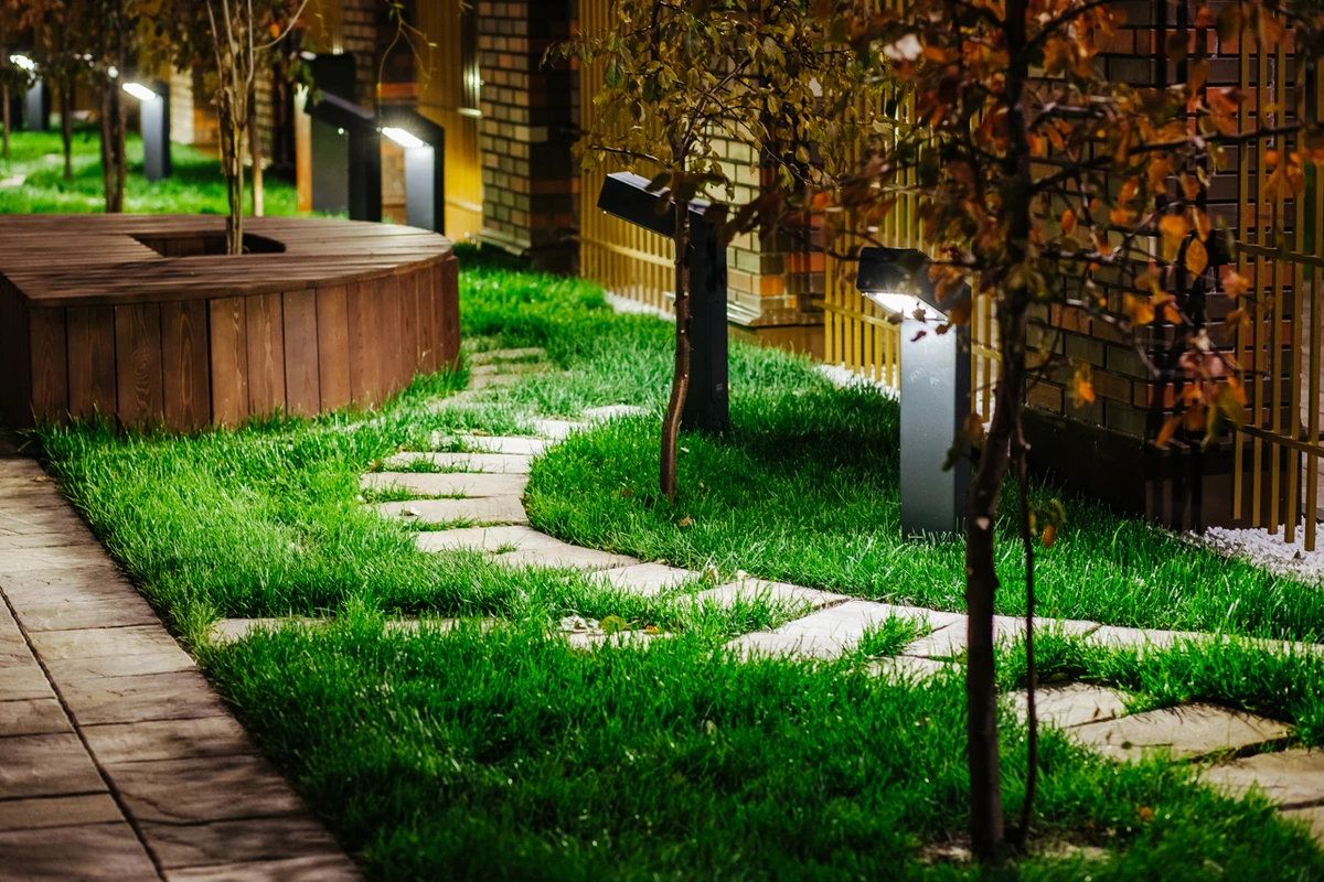 Освещение добавляет дорожке не только функциональность, но и красоту. Это необязательный элемент декора, однако с настроенным освещением снижается риск получить травму в темноте, когда люди подворачивают ноги из-за того, что нога ступает в пространство между плитками.