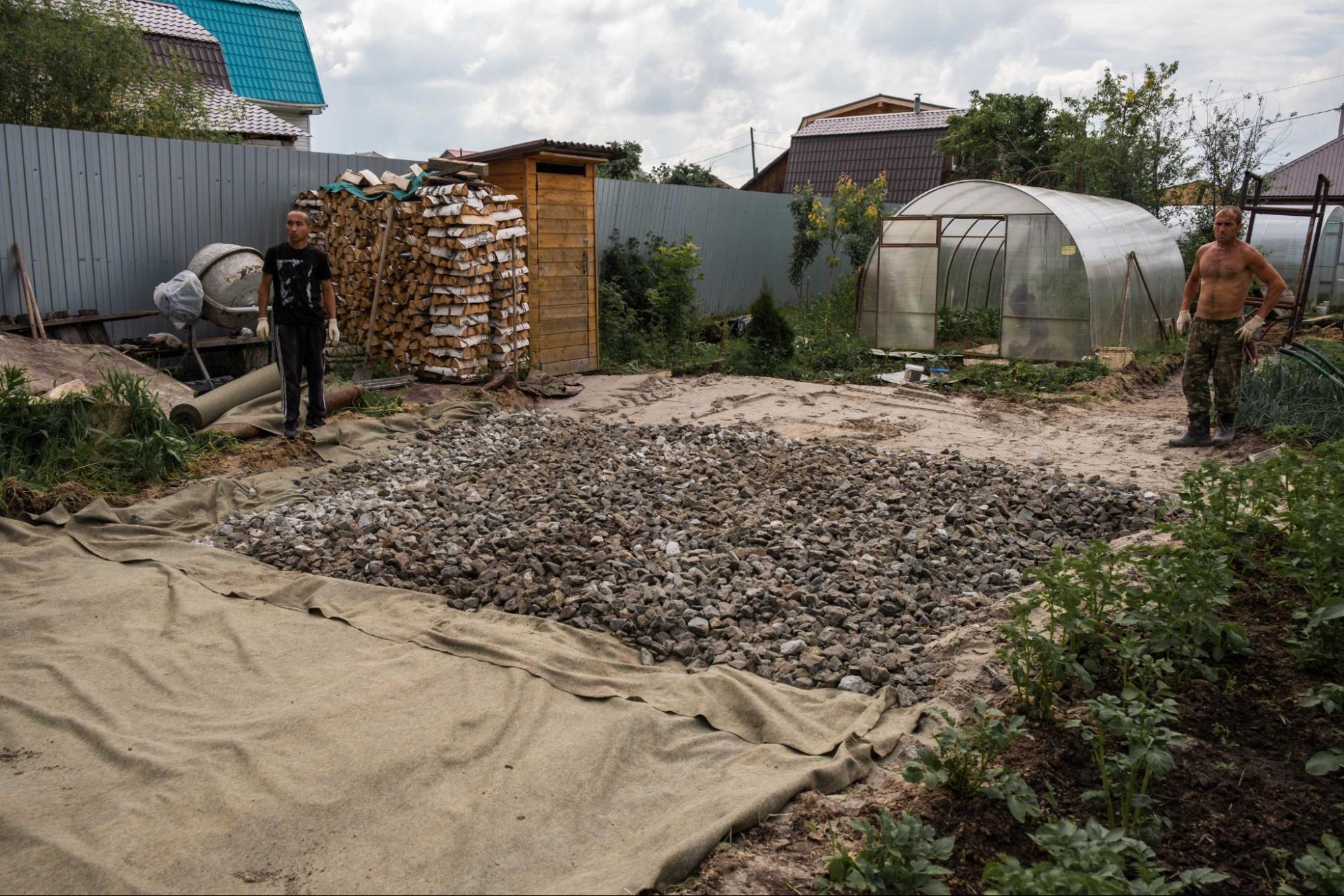 - Нанесение выравнивающего слоя: отсева песка и щебня.