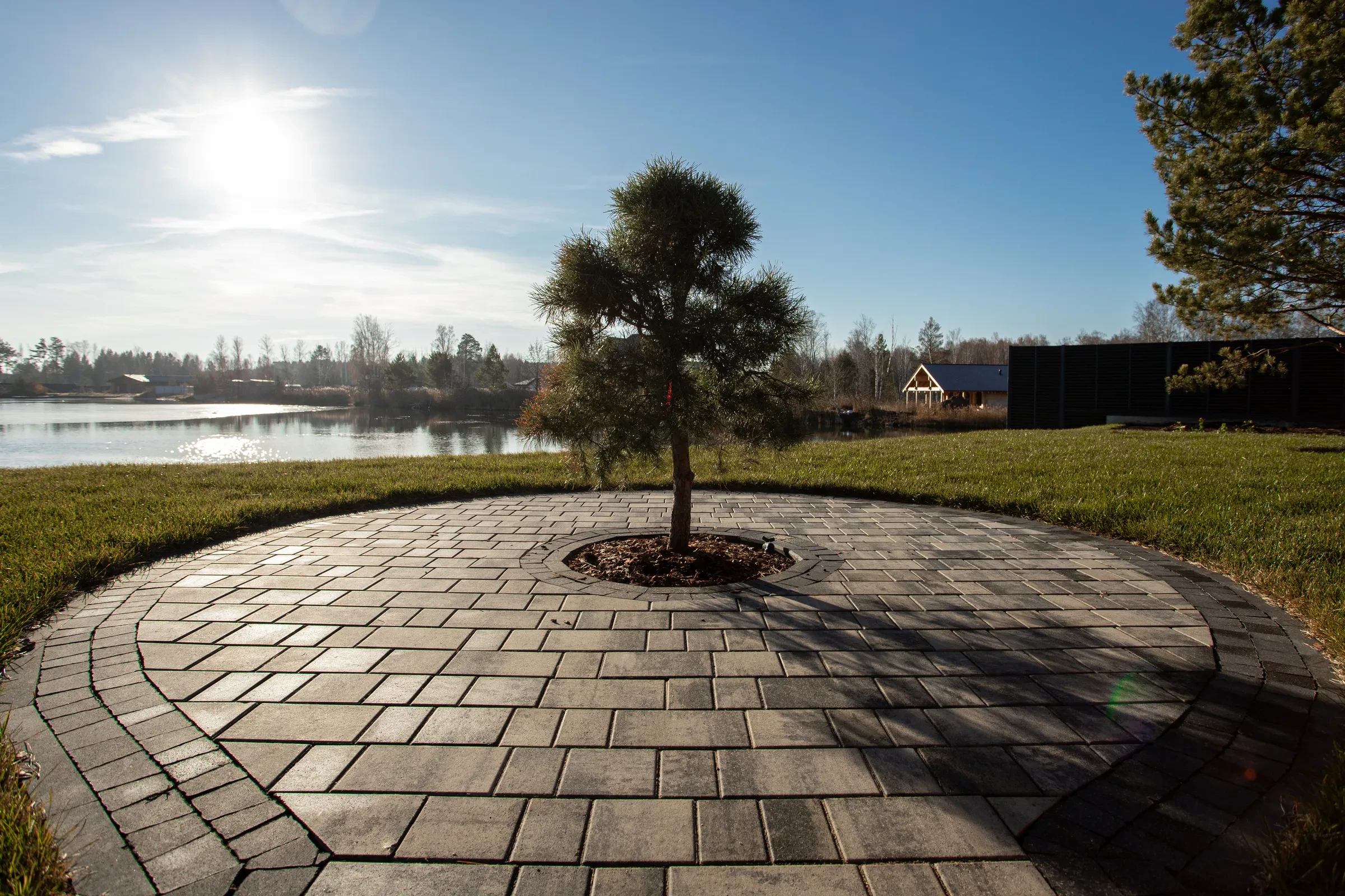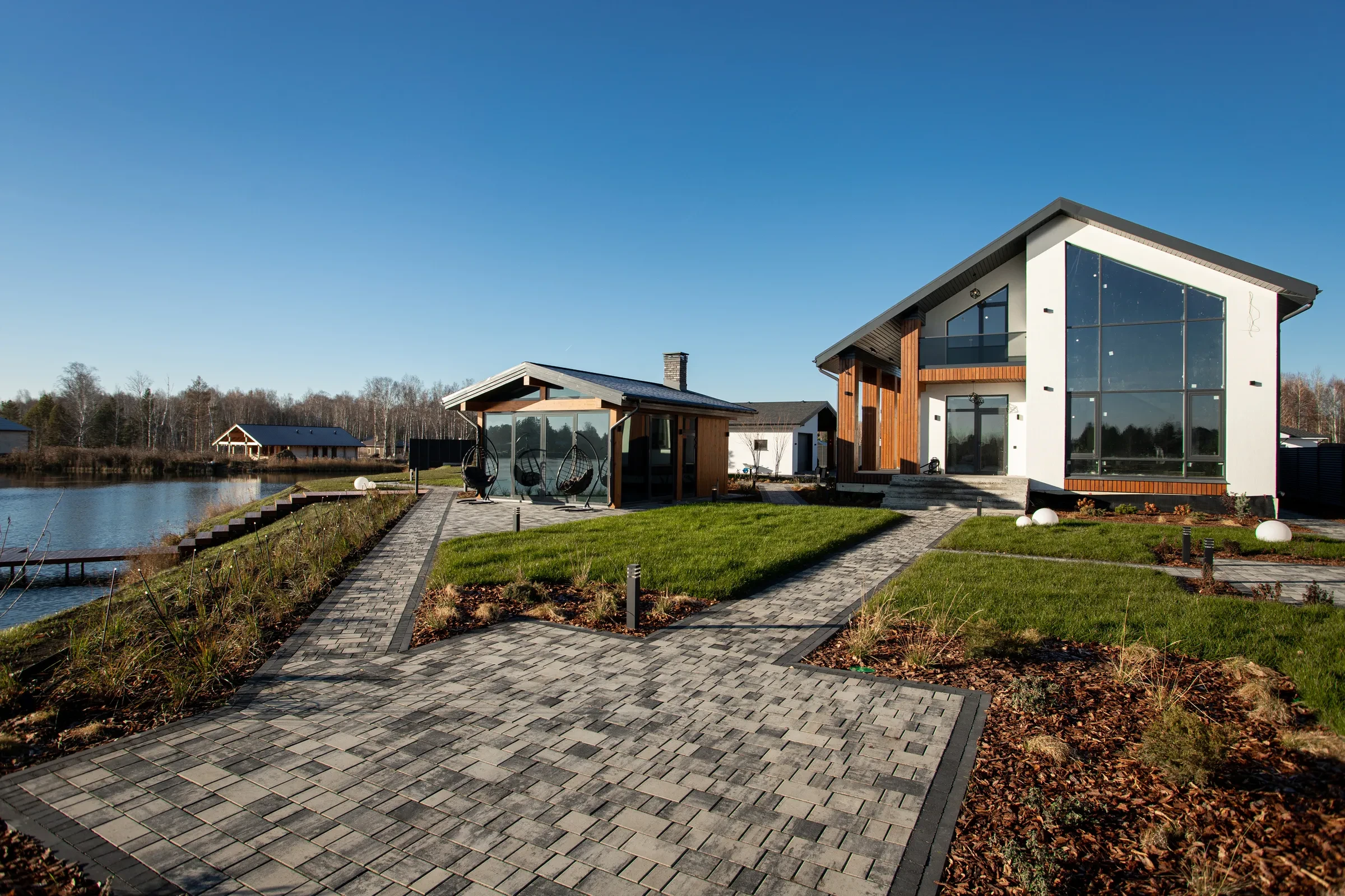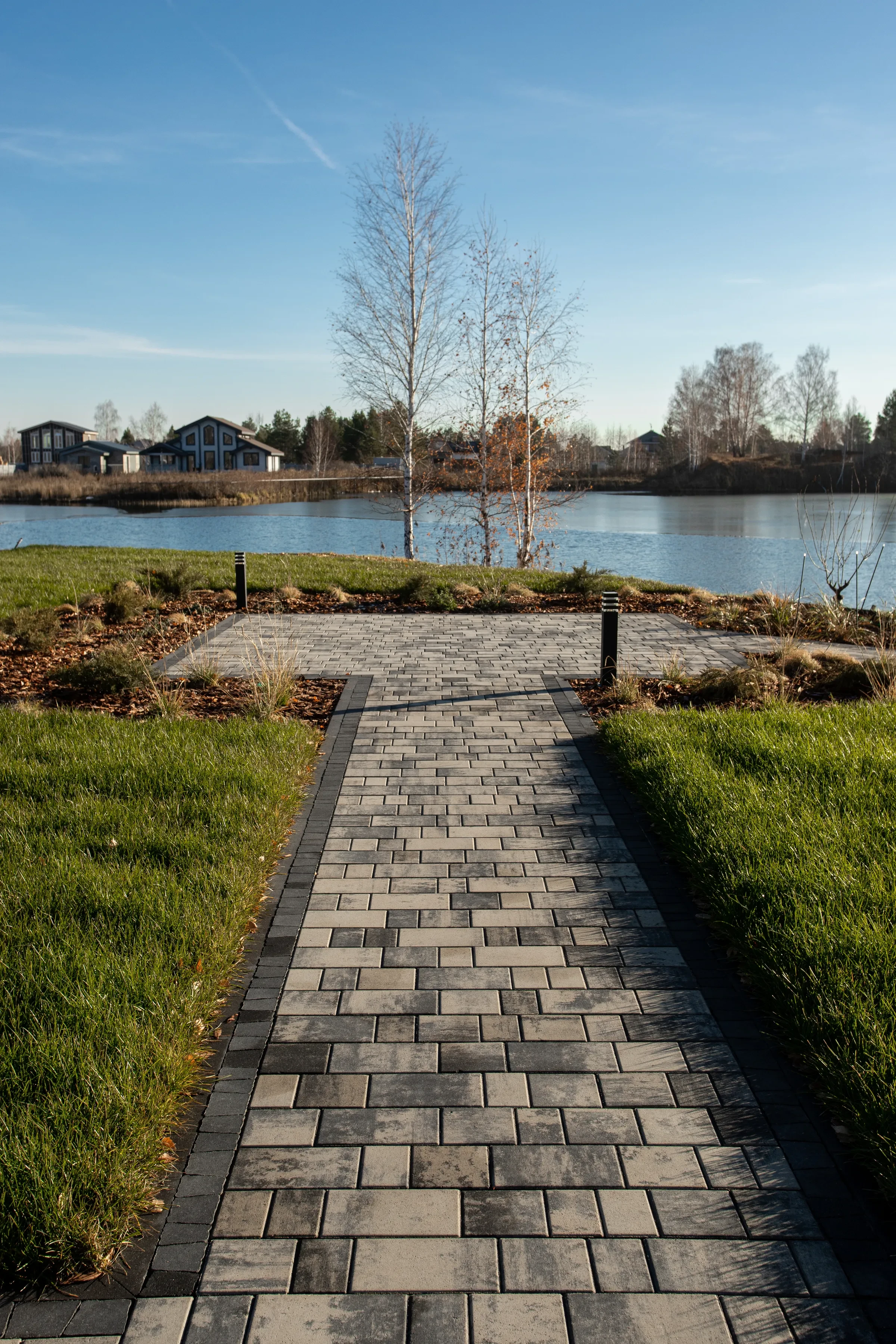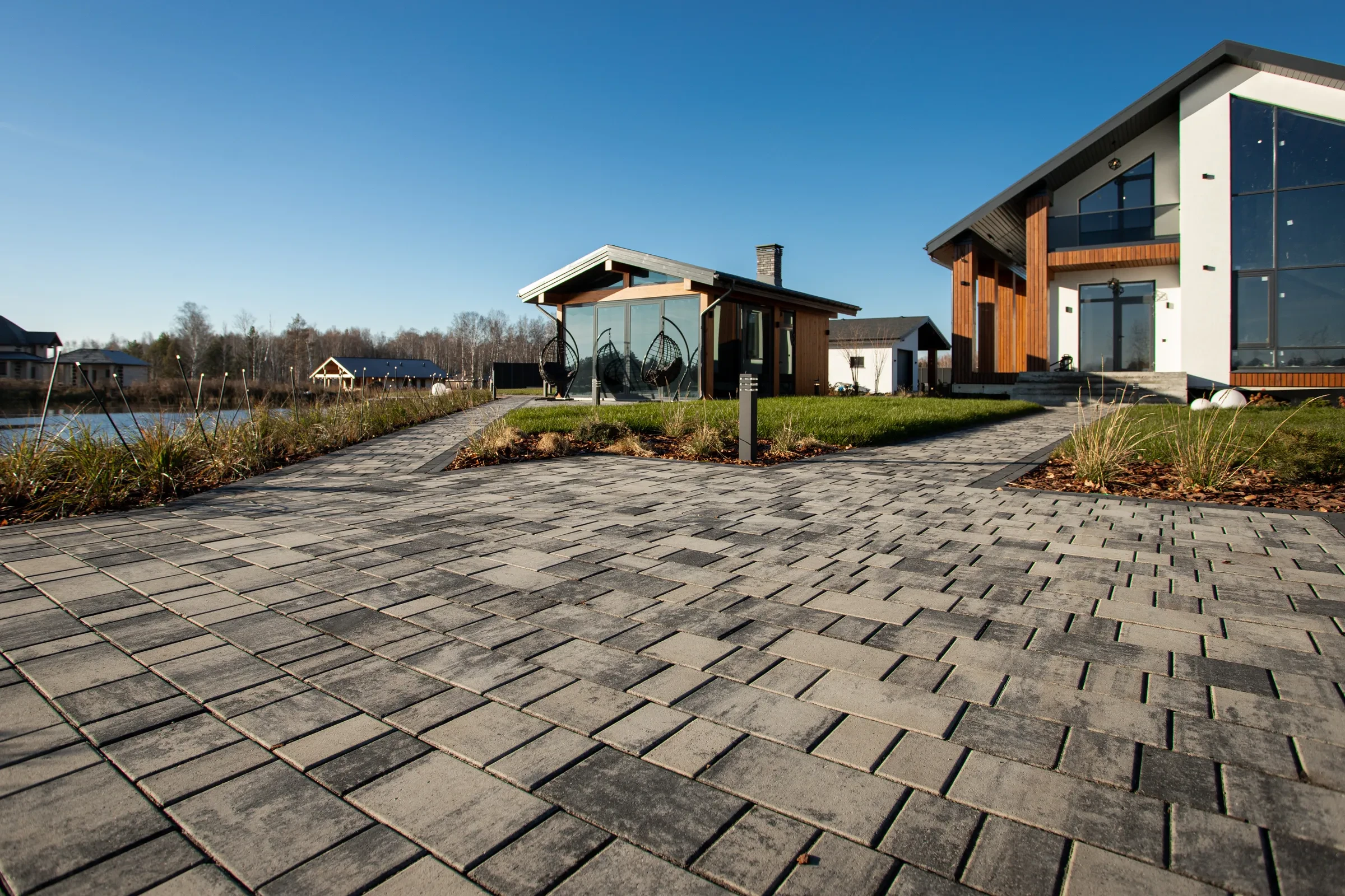 Выполненная работа в Укладка тротуарной плиты на участке с озером - Завод «Поревит»