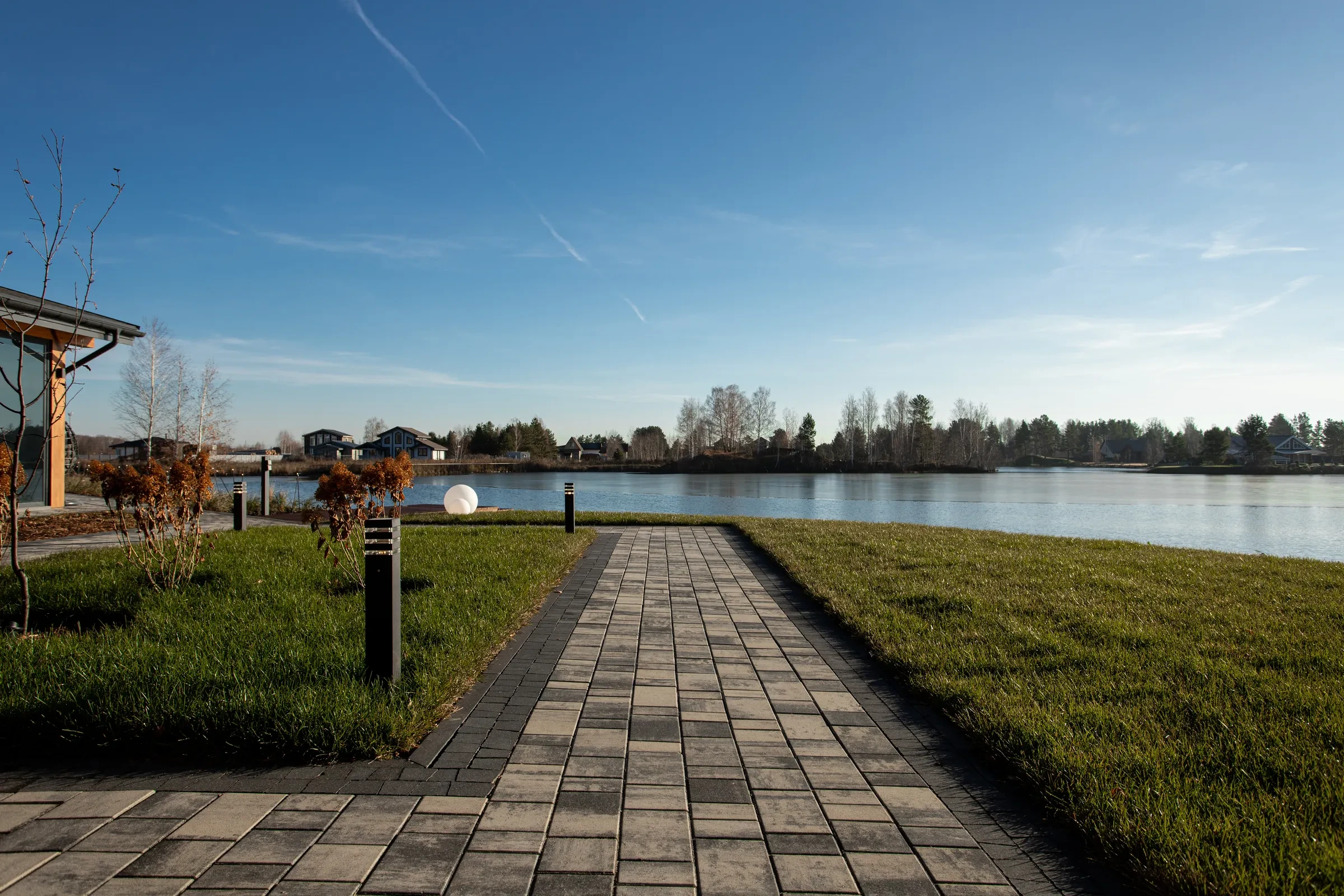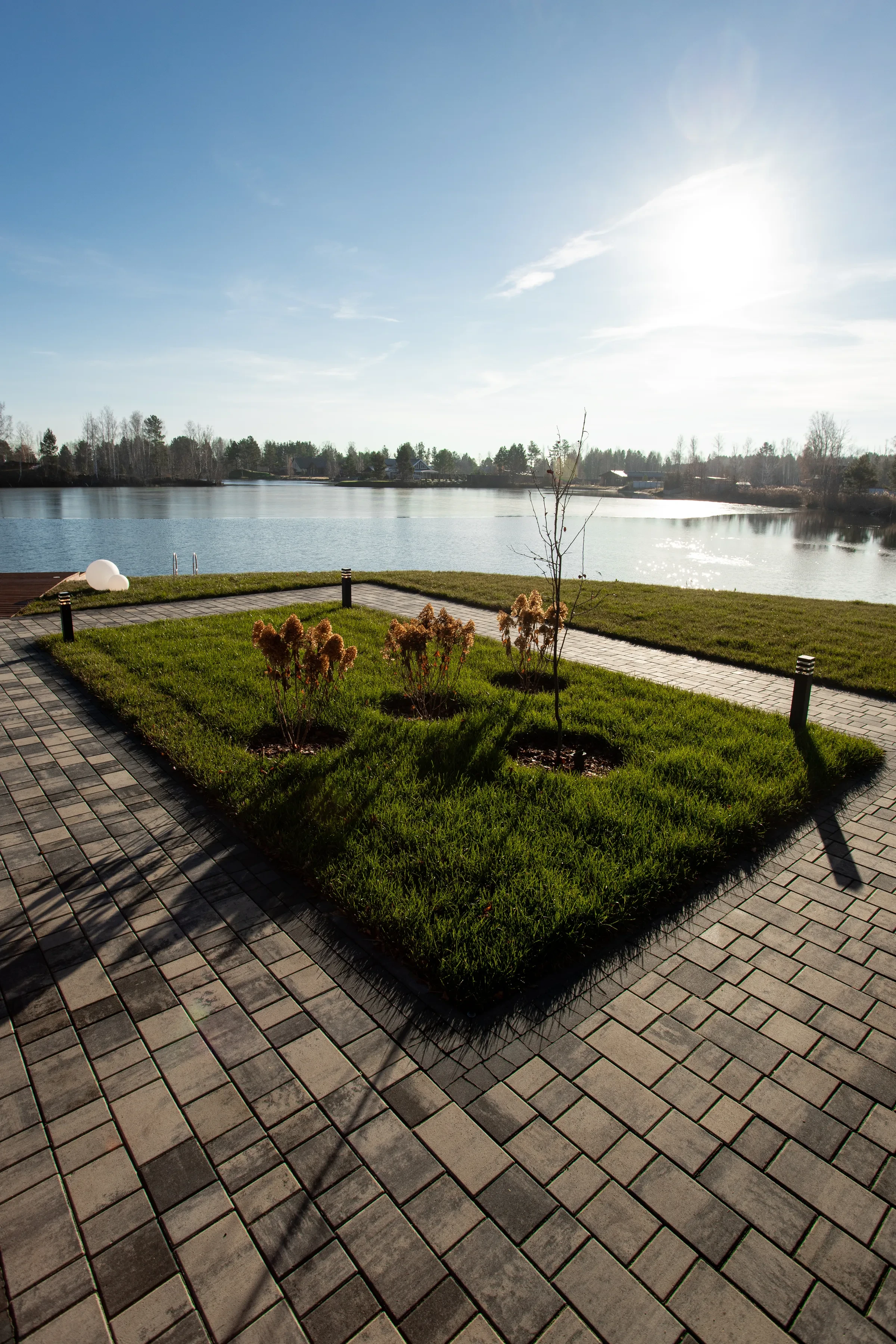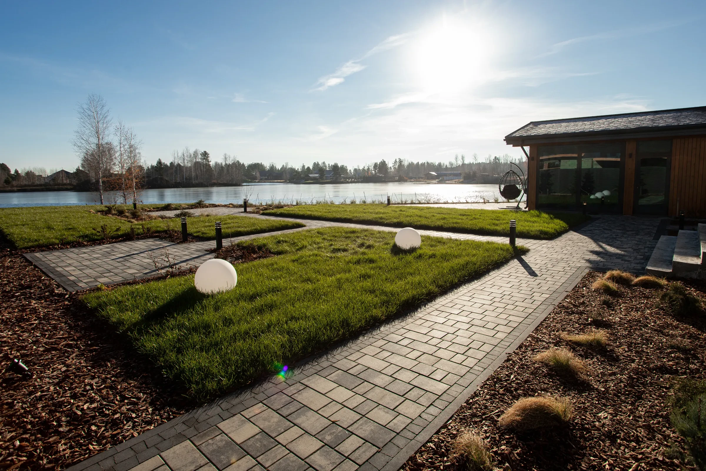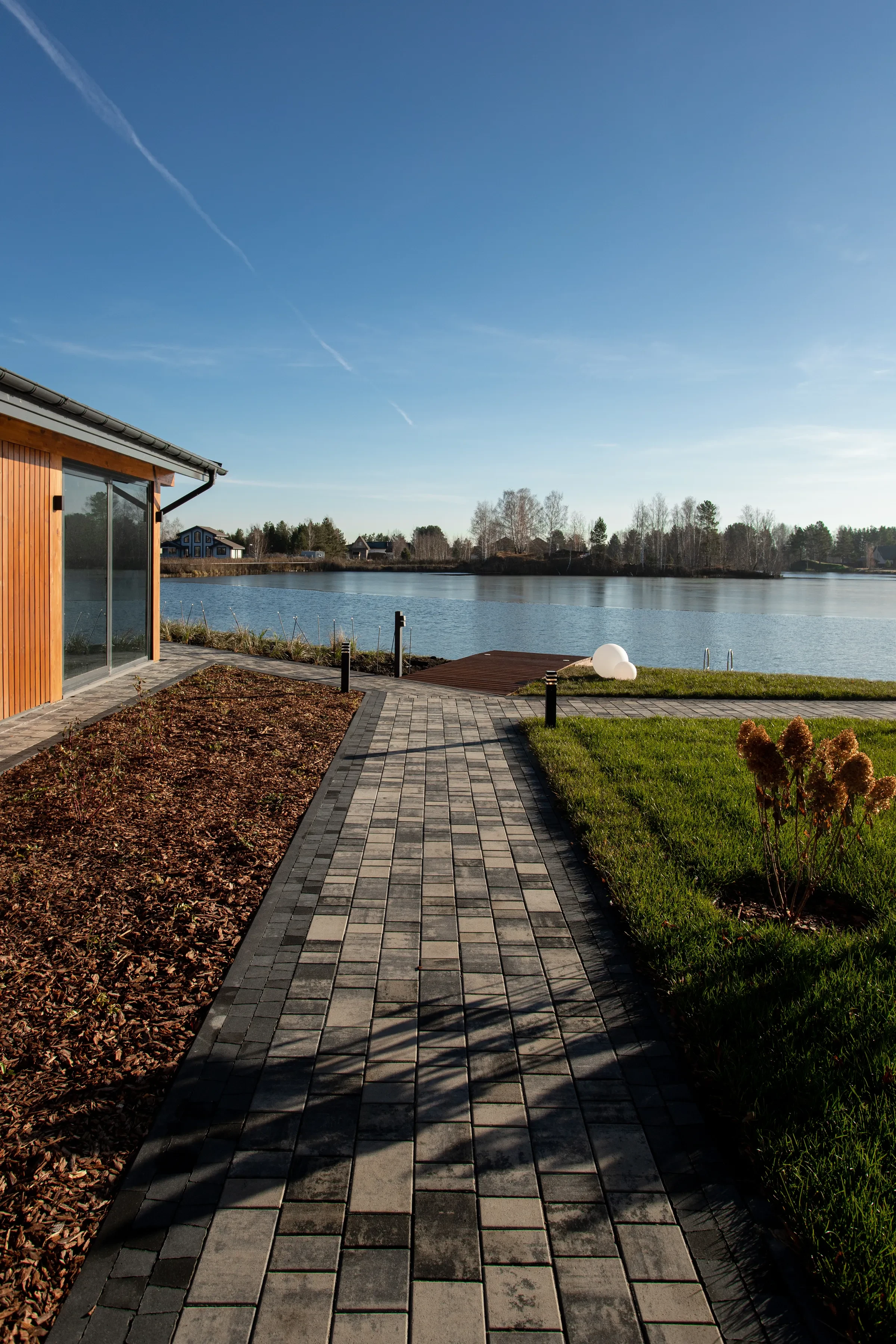 Выполненная работа в Укладка тротуарной плиты на участке с озером - Завод «Поревит»