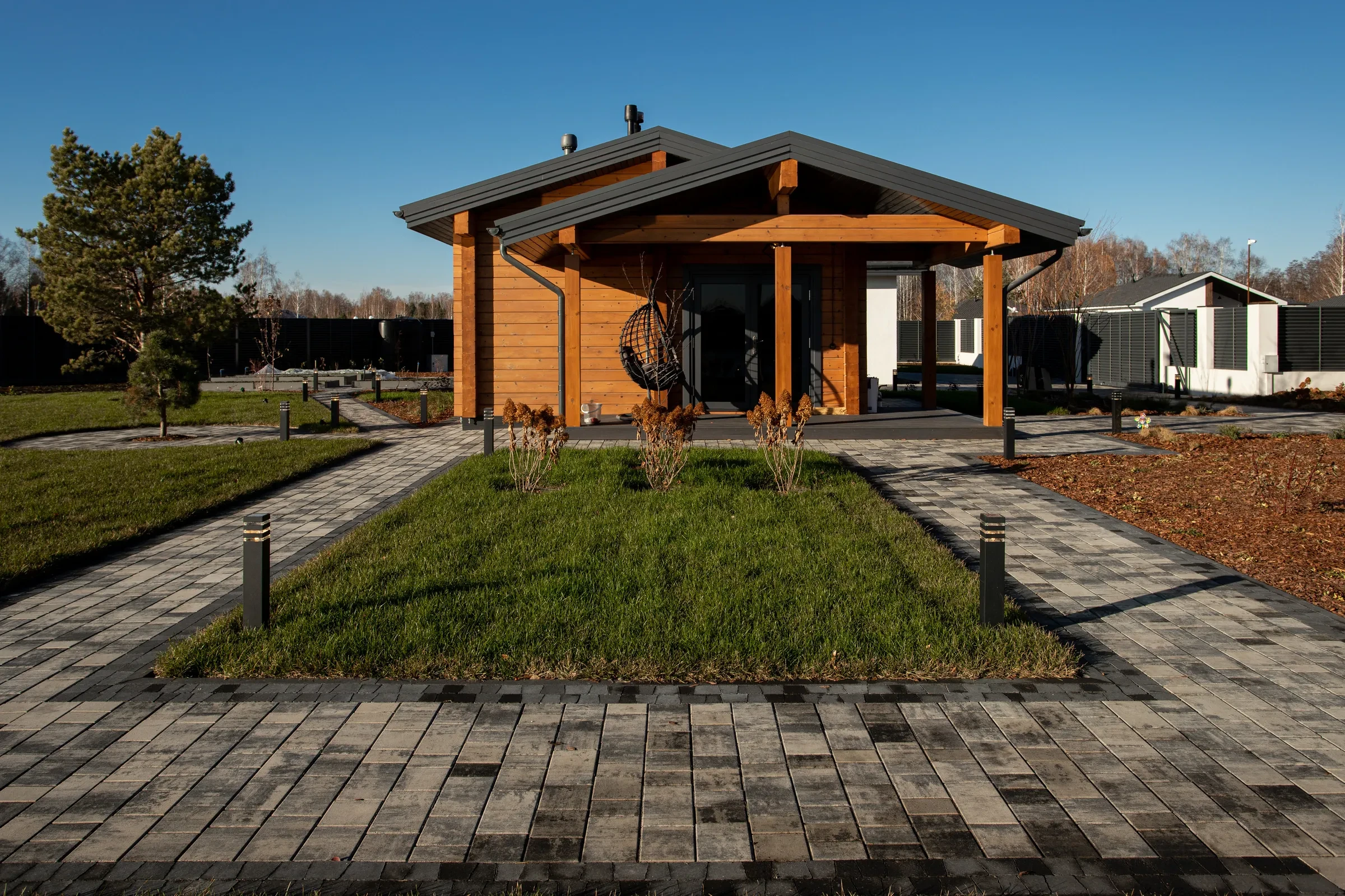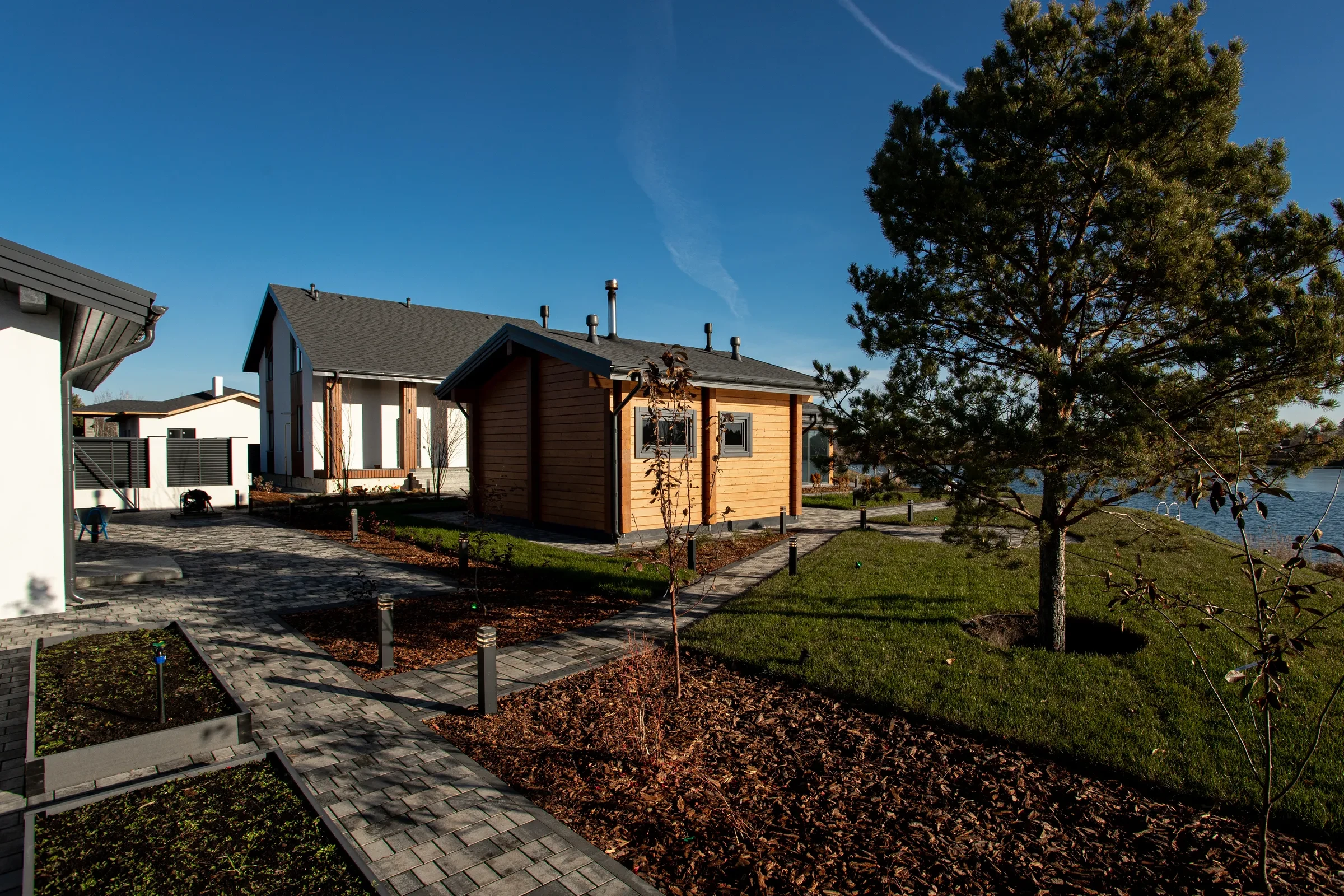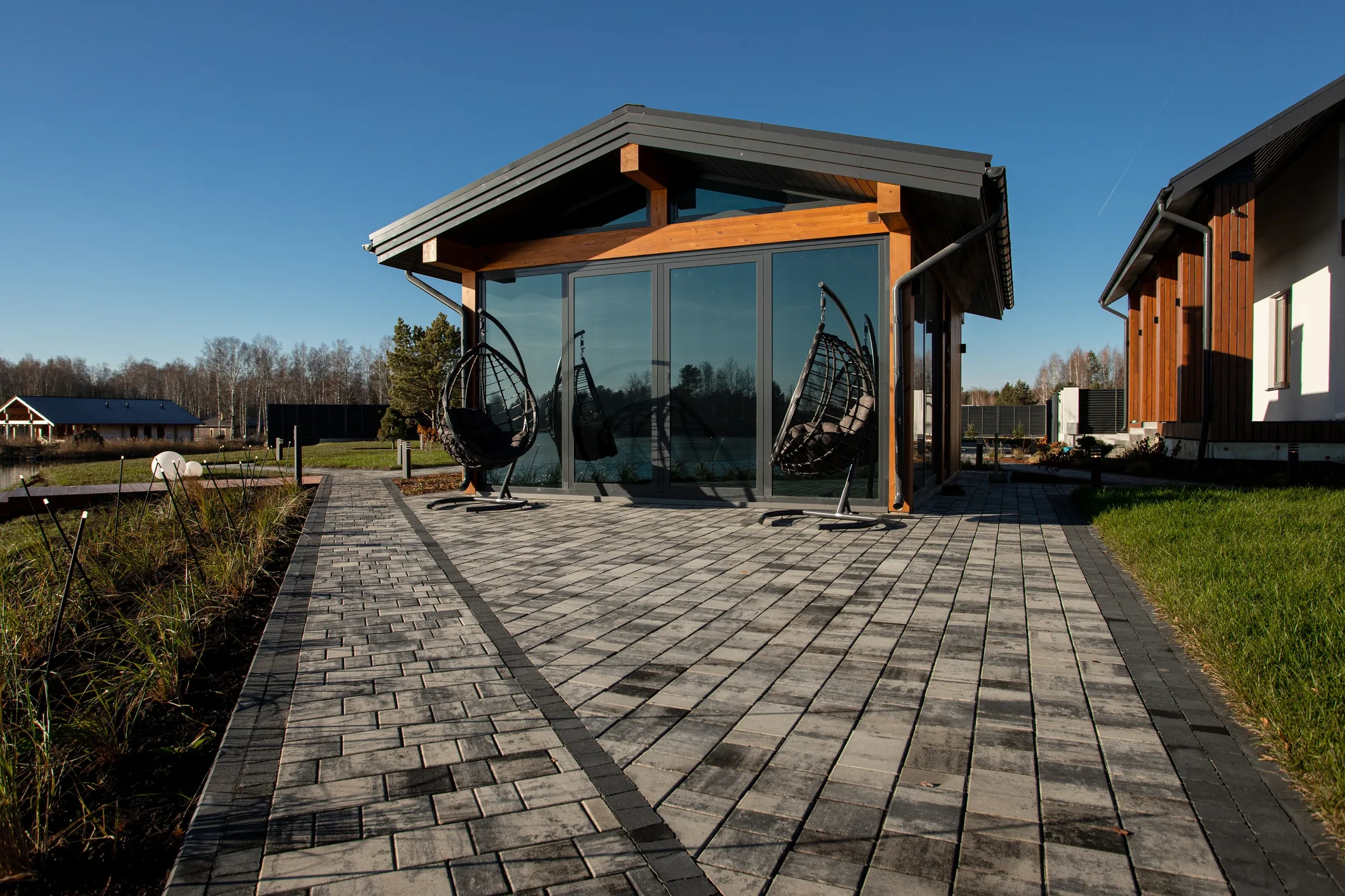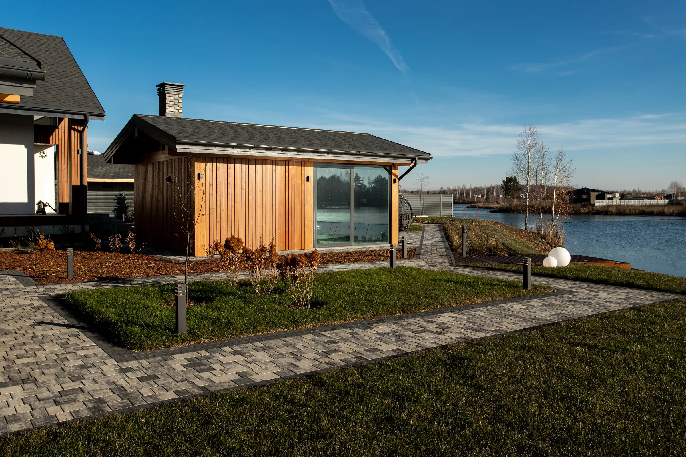 Выполненная работа в Укладка тротуарной плиты на участке с озером - Завод «Поревит»